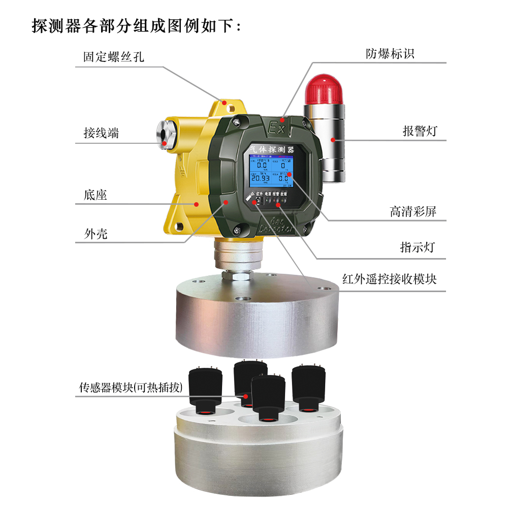 產品概述:T1000-M4彩屏分體式四合一氣體探測器應用于現場24小時連續在線監測,現場液晶濃度顯示和智能一體聲光報警,傳感器模組單元,可帶電插拔,現場真正免標定,實現低維護成本,整機高防護等級,適用于各種危險場所和強酸強堿的腐蝕性環境。